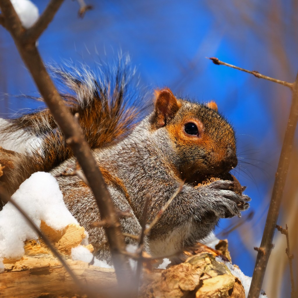 I didn’t see anything at the north end except a few little birds who had no time for me today. Instead, on my way back south, I found this gray squirrel intently gnawing on a nut.