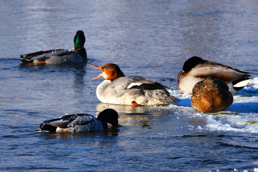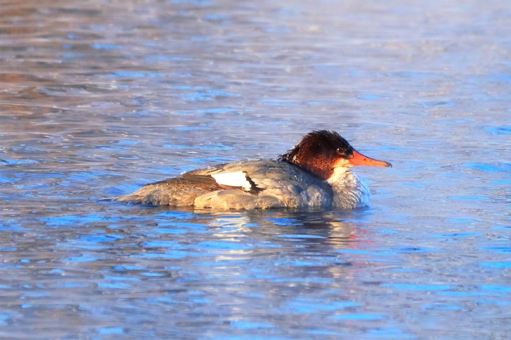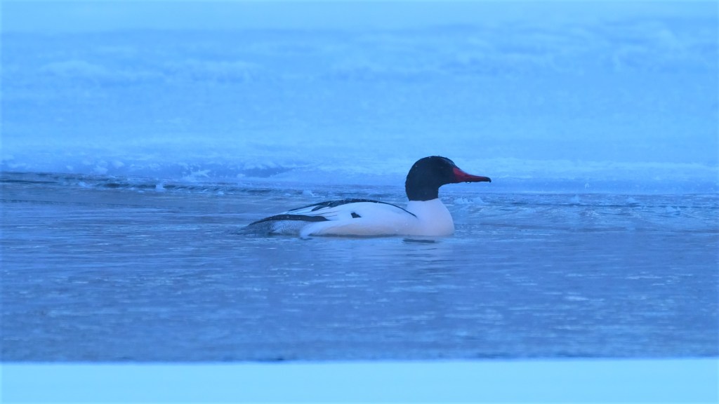 At the north edge of the open water, the sun started to reach down to the surface, and lit up this frosty common merganser hen for us.