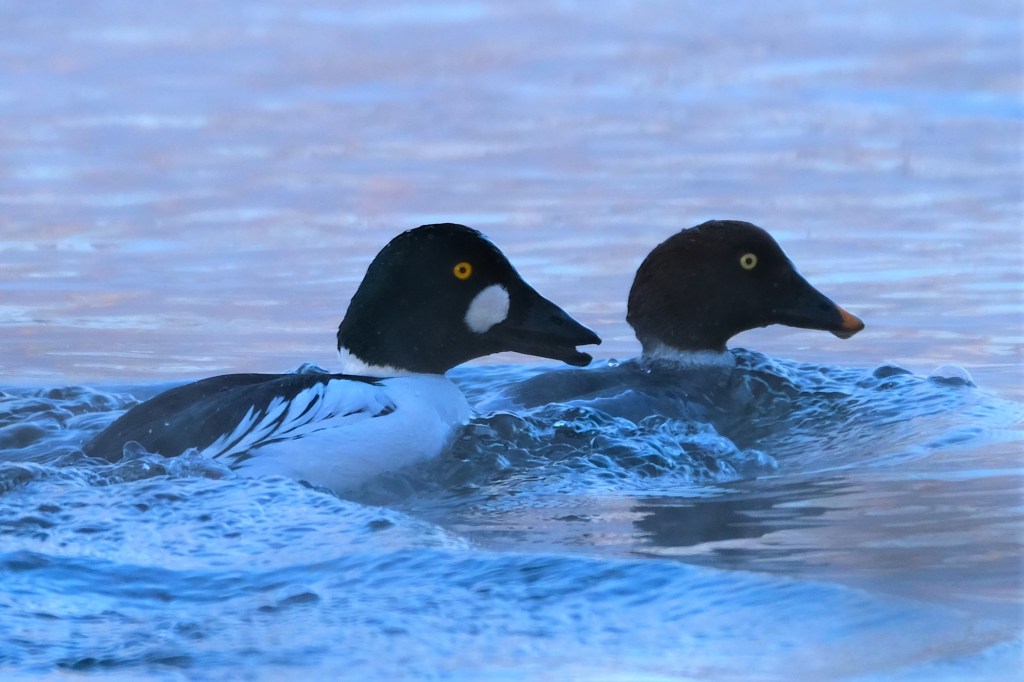 A bit beyond him, I started seeing goldeneyes. I counted at least two drakes and four hens, and here are a pair together. He might be having a front defroster issue, as the gadwall drake did a while ago, but I can’t say for sure.