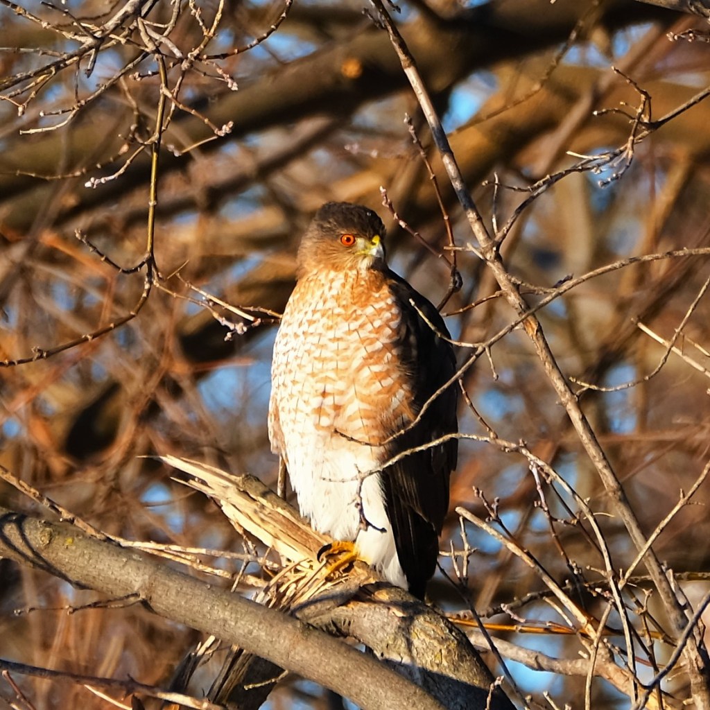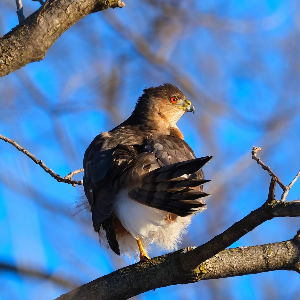 He didn’t stay long, and my fingers were too numb to take any more pictures, so I put my heavy mittens back on and continued north. I didn’t see a bird at the falls, which might be a first, and kept right on going to the north end. There I was thrilled to find yet another marvel, this Cooper’s hawk looking out over the frozen river and soaking up some sunlight.
