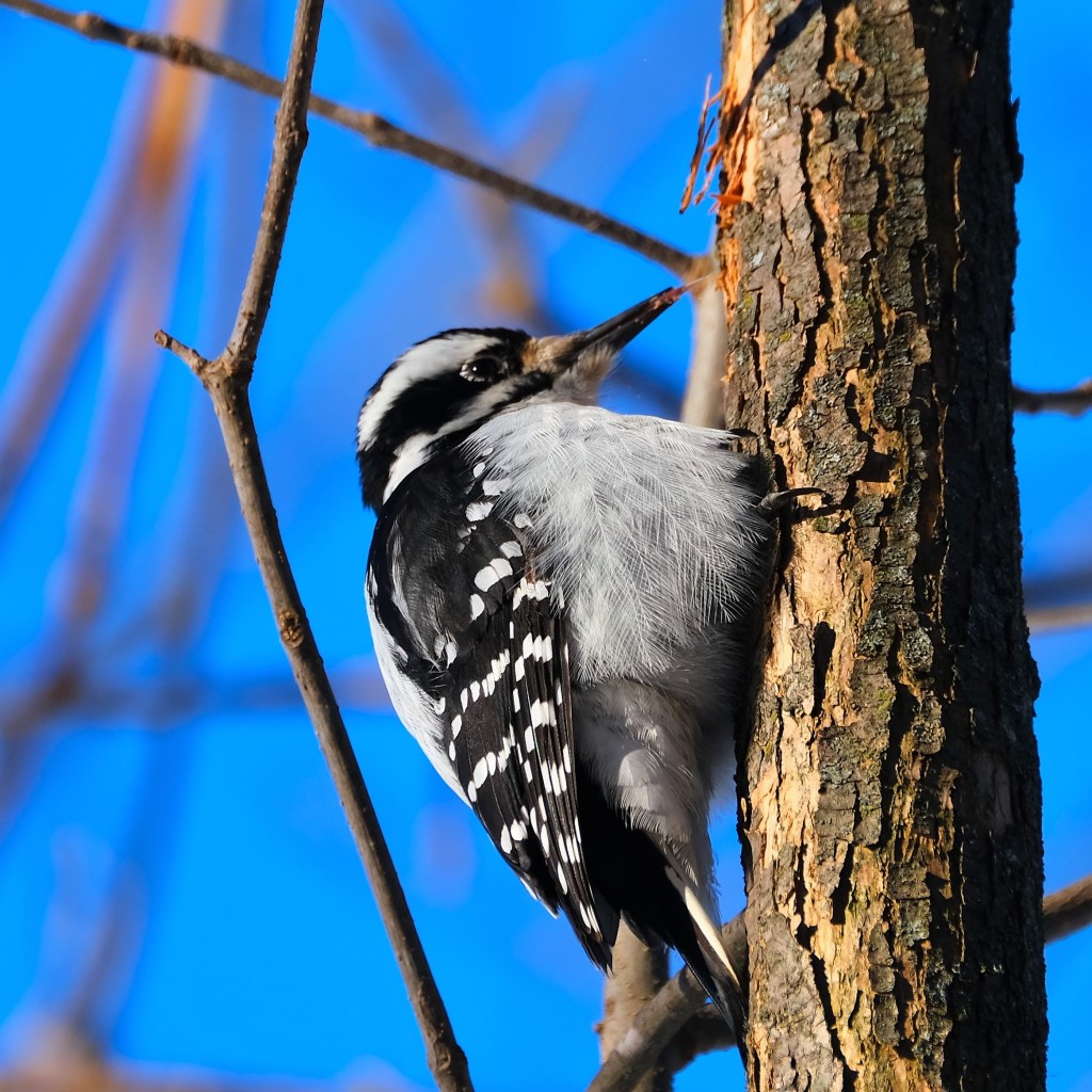 Lastly, back at the south end again, I heard the kingfisher but couldn’t spot her. Instead, here’s a female hairy woodpecker fishing something out of a branch with her tongue. Yum!