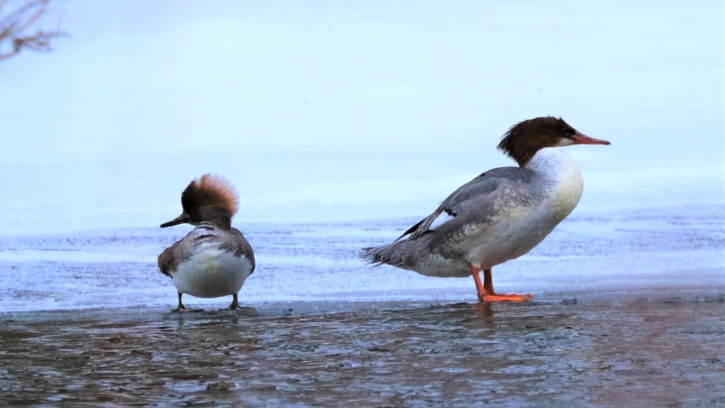 One fun picture I did finally manage to capture is this one of the two merganser hens up on the ice at the same time. Now you can really see the difference between a hooded merganser, on the left, and a much-larger common merganser, on the right.