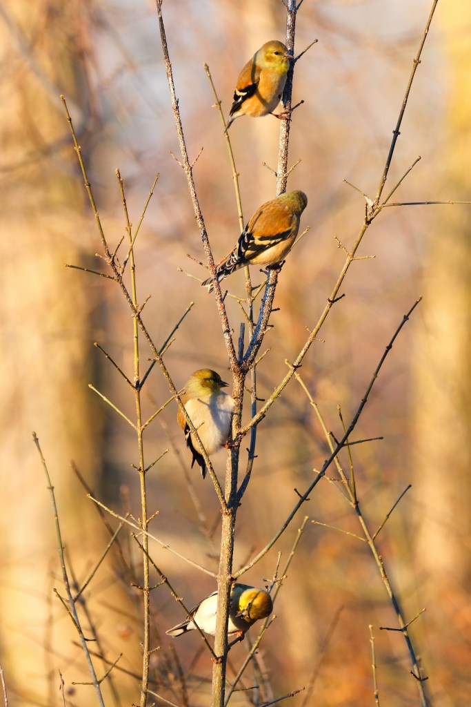 There was no sign of our kestrel, but at the north end of the grassy area, the sun was starting to shine down into the river valley, and these goldfinches were doing their best to take full advantage of it.