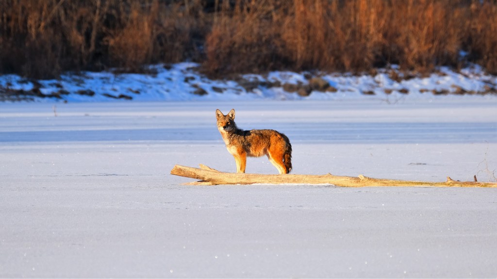 At the far north end, I could hear some crows squawking again, and I had a hope of finding a raptor or two, but I couldn’t see anyone but the crows by the time I arrived. Then this beauty trotted out across the ice heading west from the northern island.