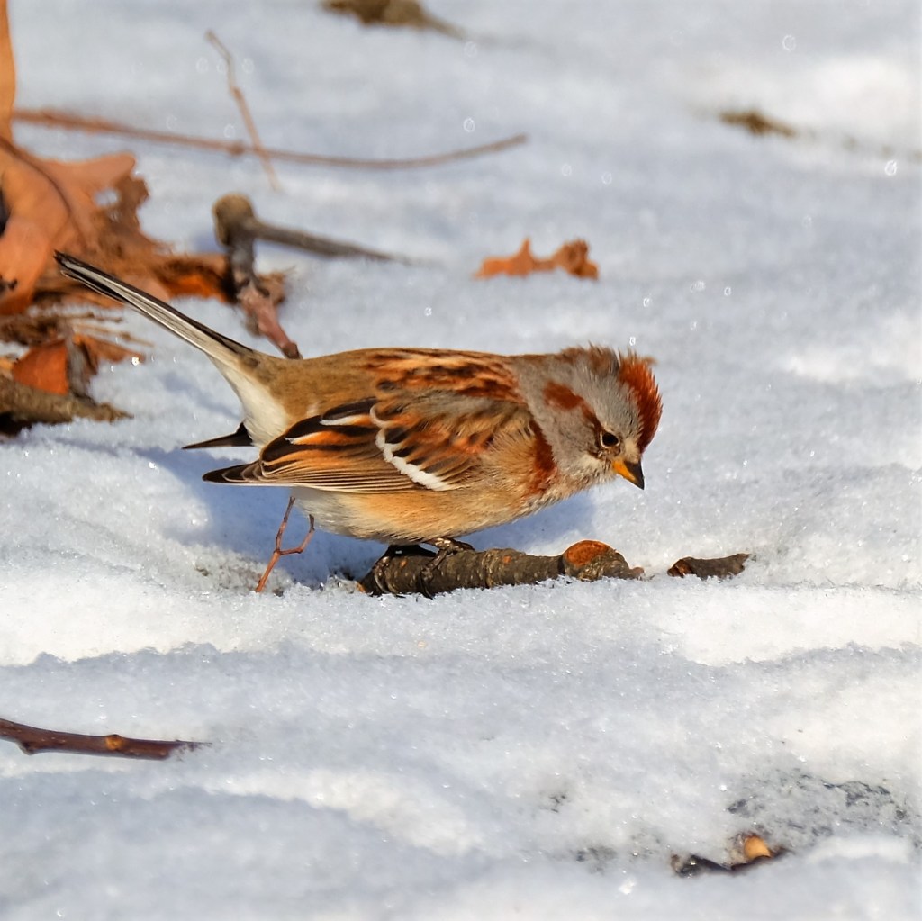 I swung by the pond, just to see if anyone new was around, and found the usual contingent of shy house finches, house sparrows, dark-eyed juncos, and this one intrepid American tree sparrow.