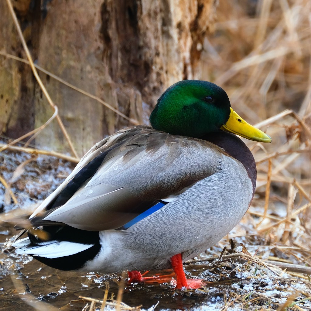 Finally, from the pond, I dipped back down to the open water on the river to see if anyone had returned, and I was stunned to find a single pair of mallards so far up onto shore that they were parked right on the lowest segment of the river trail. I snapped this picture of the drake, while the hen hid behind some tall grass just to his left, and then I turned around to let them hide out in peace from whomever they were hiding out from.