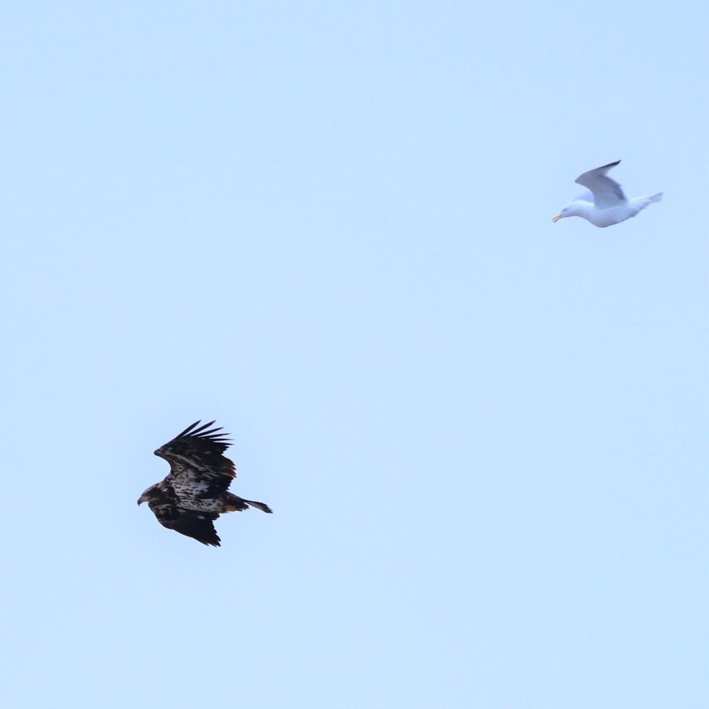 Yesterday afternoon got off to an exciting start when I notice a gull squawking about something up ahead and found this scene when I was finally able to take a look. At first, I thought the gull was harassing a red-tailed hawk, but once I got a chance to zoom in on the picture I took, the mottled brown and white underside told me it was a juvenile bald eagle instead. Sweet! We haven’t seen one of those in a while.