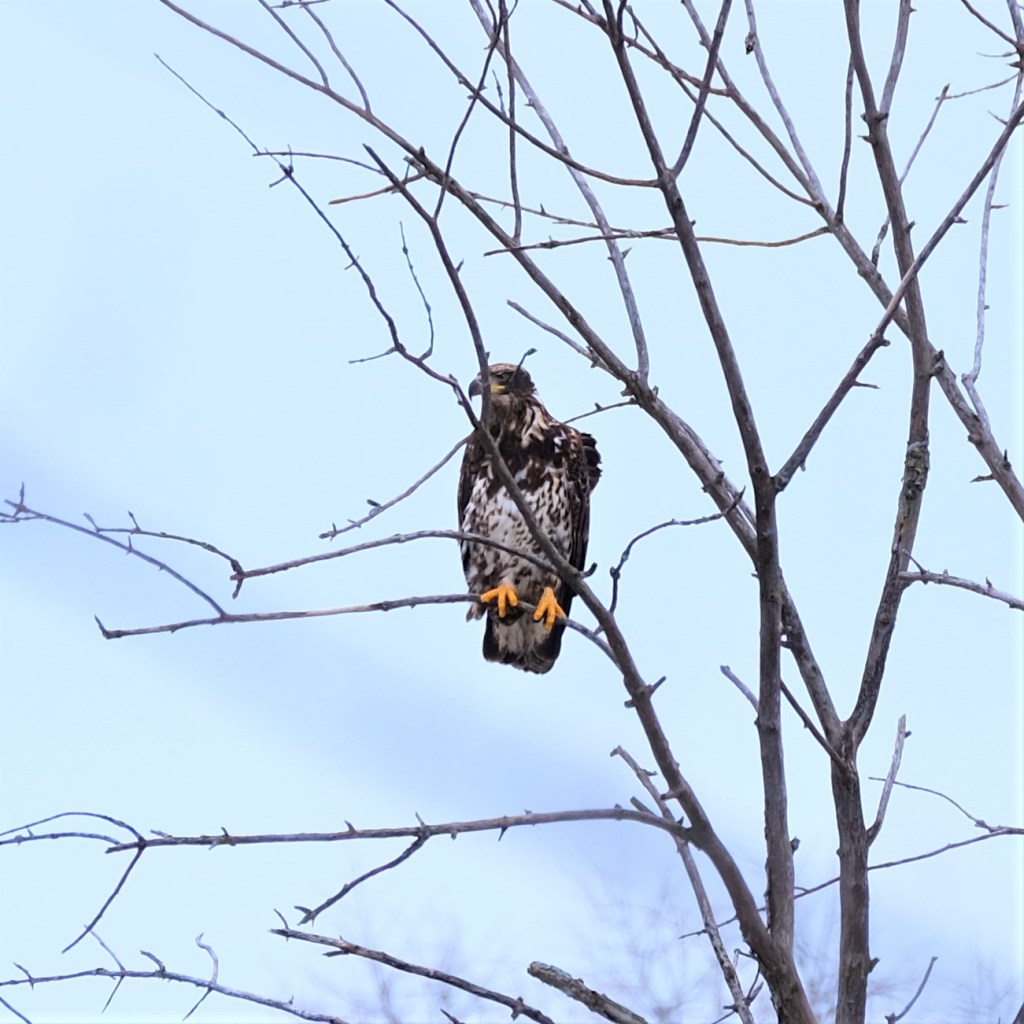 At the north end this morning, I arrived in time to find both of the red-tailed hawks soaring directly overhead, and I managed to capture this image of one of them. You can really see the difference between them and the juvy bald eagle from yesterday above.