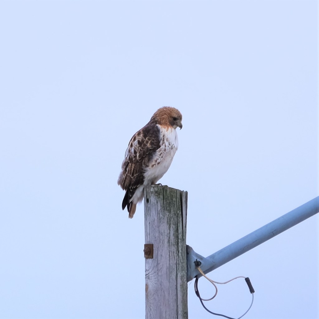 As if that wasn’t enough raptor for the day, look who was also out and looking for some lunch at the far north end. One of our two red-tailed hawks was perched on a lamp post behind the chocolate factory.