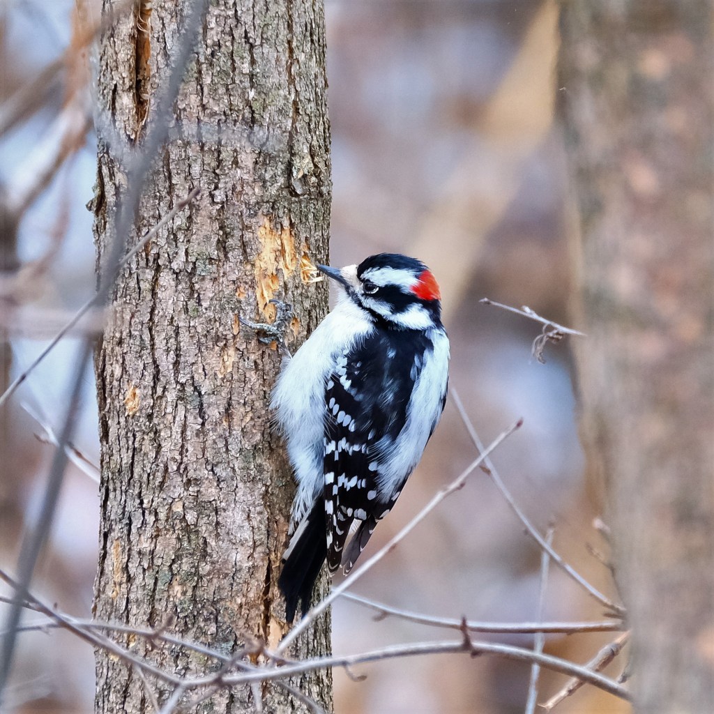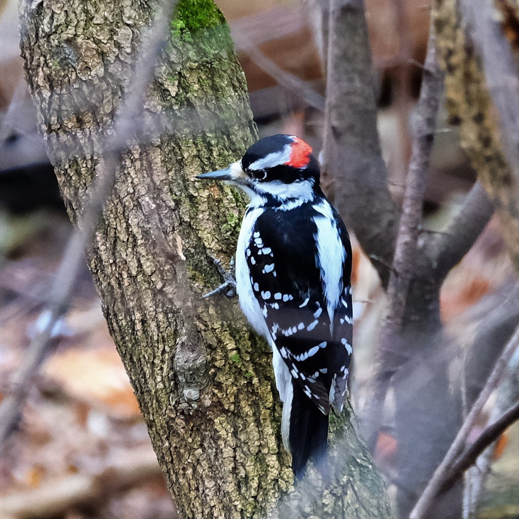 The downy and hairy woodpeckers are as busy as ever these days, and here’s a male downy at eye level from yesterday at the north end with his diminutive beak and a hint of black on white checks along the side of his tail.