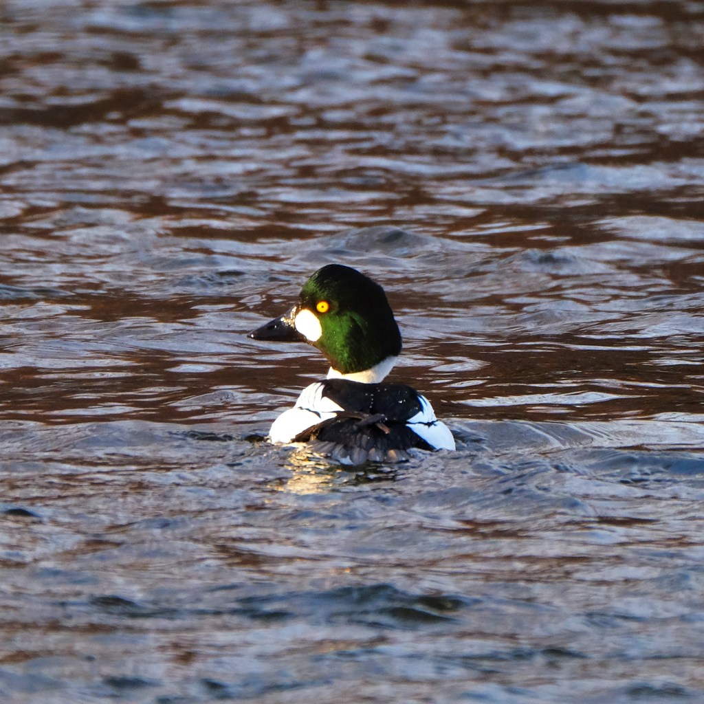 The third exciting find of yesterday was a pair of goldeneye drakes on the open water just north of the hawk. It appears that they haven’t all flown north yet. In fact, I spotted three of them this morning, and here’s one with a little morning sun shining on him to bring out the iridescent green of his dark head feathers.