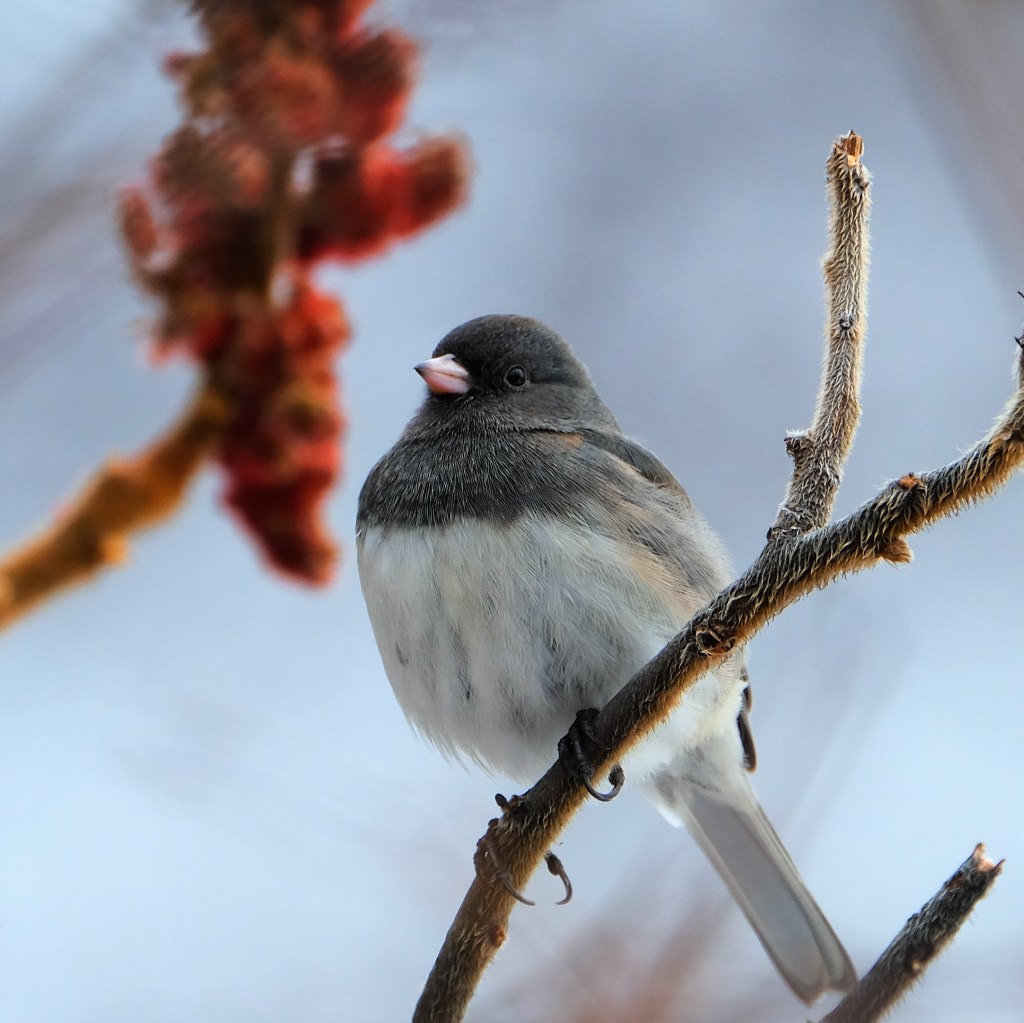 By the pond this morning, I was treated to the rare treat (Doh!) of a dark-eye junco willing to endure my gaze for a moment.