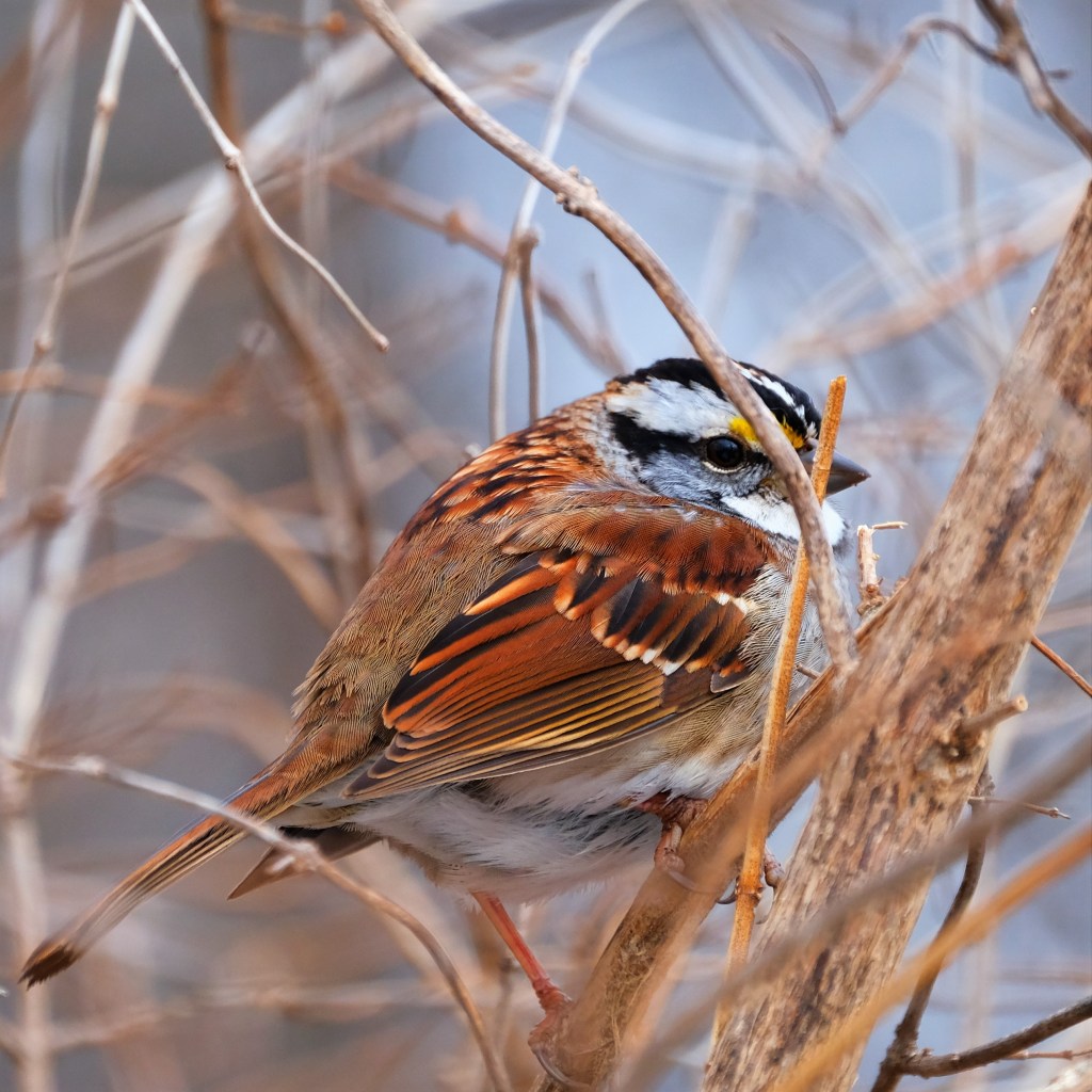 Even as I was taking the junco portrait above, I could hear the distinctive call of a white-throated sparrow nearby, so I set out to see if I could spot him. Well, this was my lucky morning, because he was nearly right in front of my face and also uncharacteristically unphased by my presence.