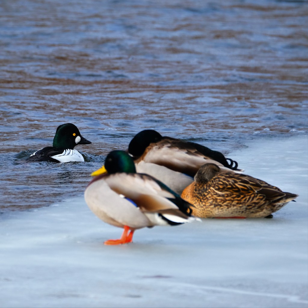 Finally, here’s another shot of one of the goldeneye drakes hanging close to some mallards for comfort.