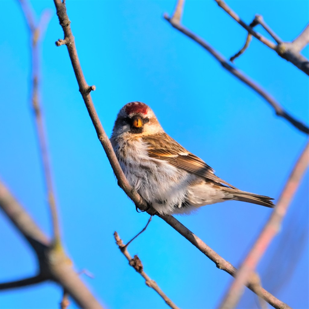 Here’s another look at the common redpoll that has the Wisconsin birding world abuzz, and in which it shows off its distinctive red cap from a different angle. I guess they are part of the same irruption that brought us the crossbills last Sunday. Plus, there are still evening grosbeaks and pine siskins to find. Yay!