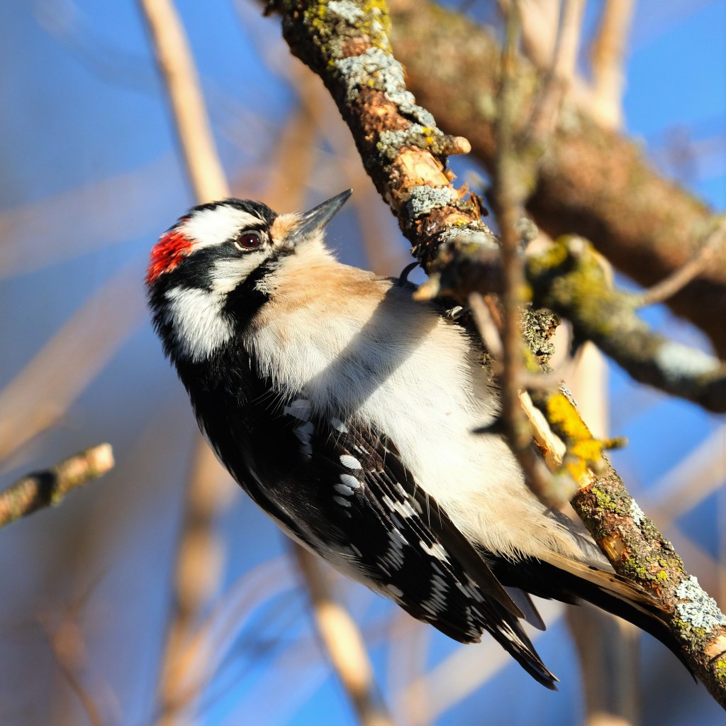 Instead, it was the woodpeckers out against that gorgeous blue sky who made for the prettiest pictures, and here’s a female downy all fluffed up at the north end.