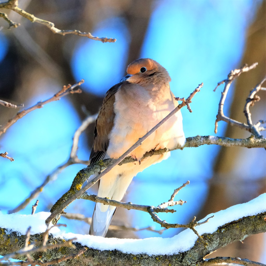 The wind had blown most of the snow off the branches, but not all of it, and this mourning dove found some to frame its portrait for us.