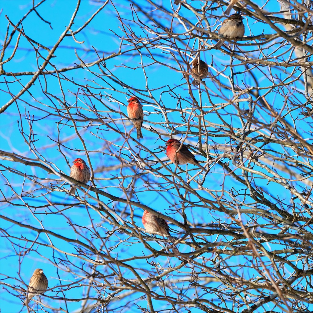 I finally found a nice clump of house finches, and one house sparrow, that I could capture in an image, warming up in the sun over the pond.