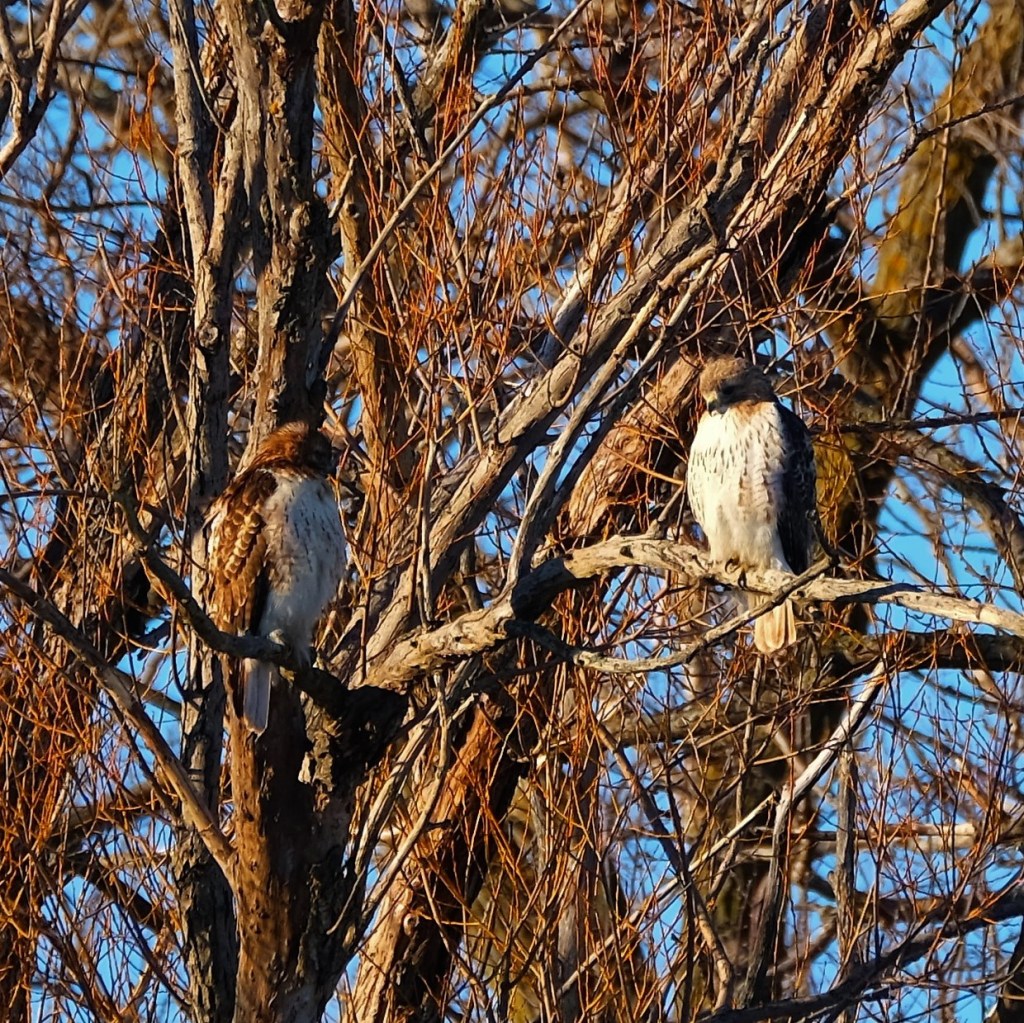 When I took the image above, I didn’t see the hawk on the left and was just happy to see a hawk at all. Farther north along the river, I had a different perspective and was all excited to see both of them.