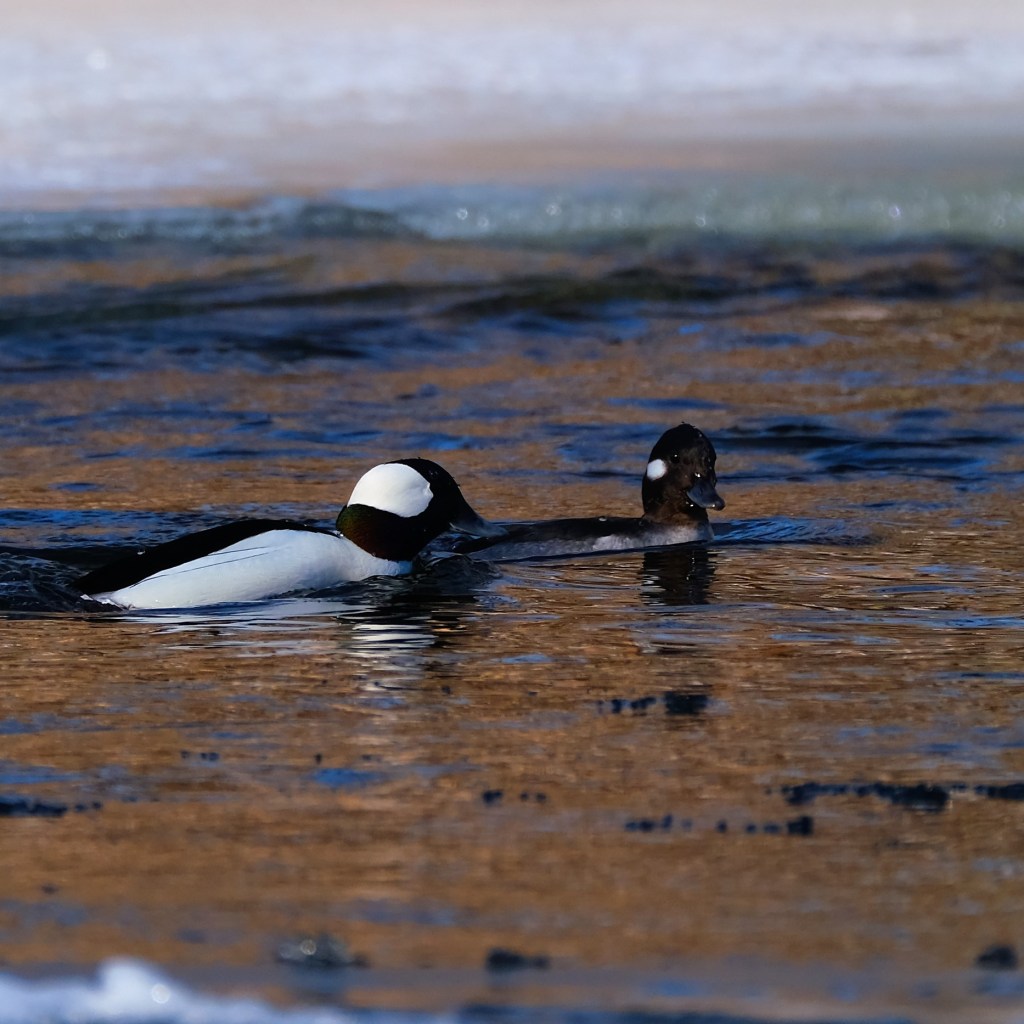 Back on the open river water far south of the falls, the buffleheads were diving without company this morning.
