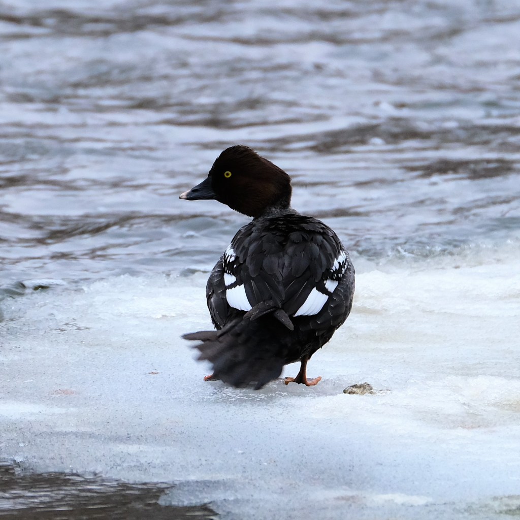 The usual cast of characters was on the river, dozens of mallards, a few goldeneyes, and the one pair of buffleheads. Here’s a goldeneye hen up on the ice again.