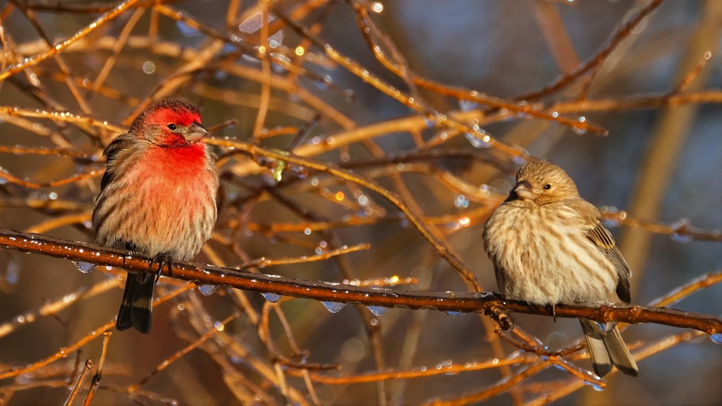 Here’s a pair of house finches by the pond, who had been singing in a chours until I walked up, now just silently soaking up some sun.