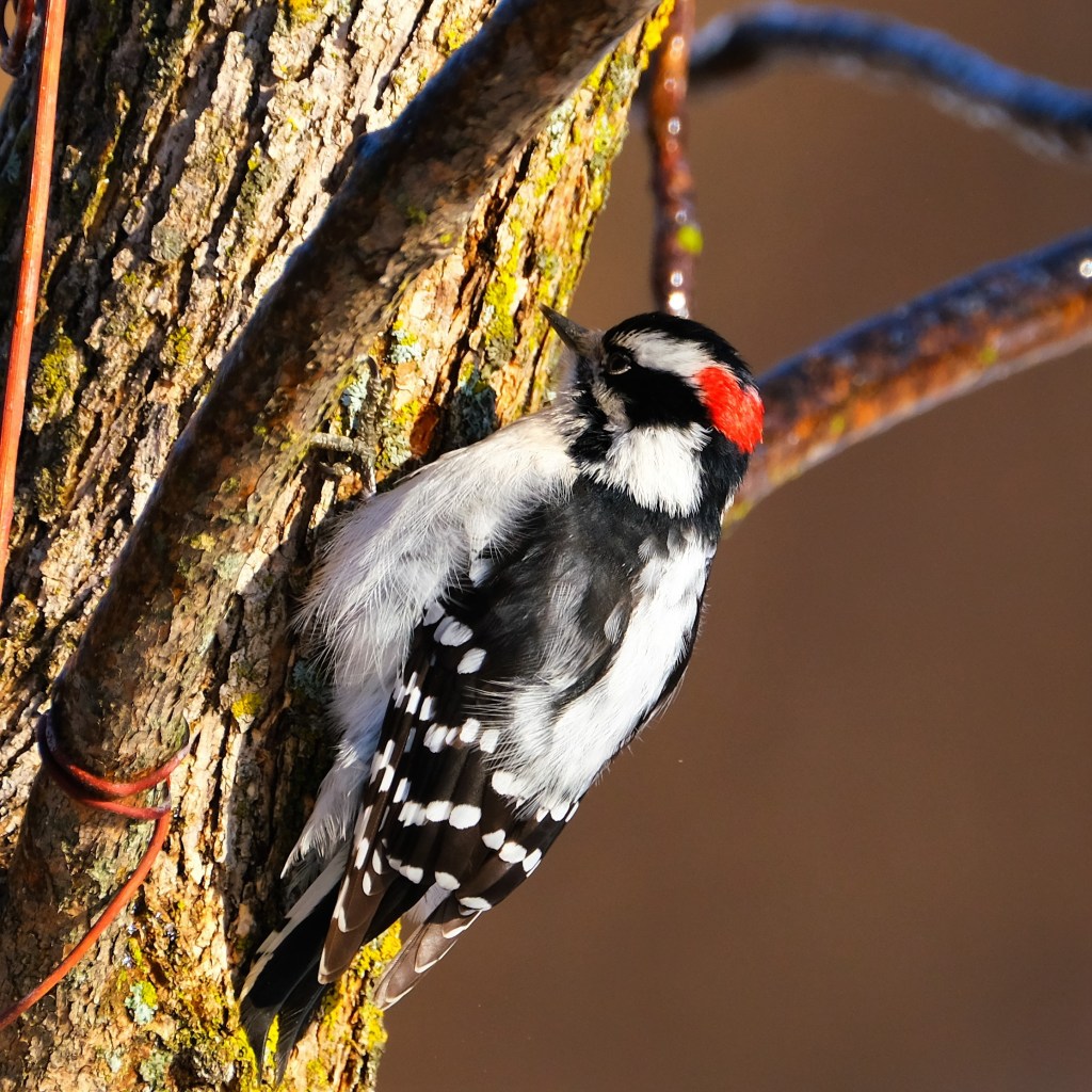And here’s a male downy woodpecker by the pond hard at work and ignoring all the rest.