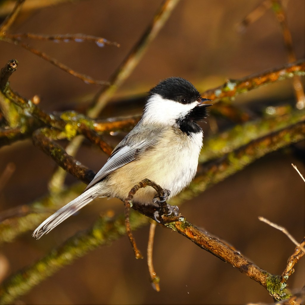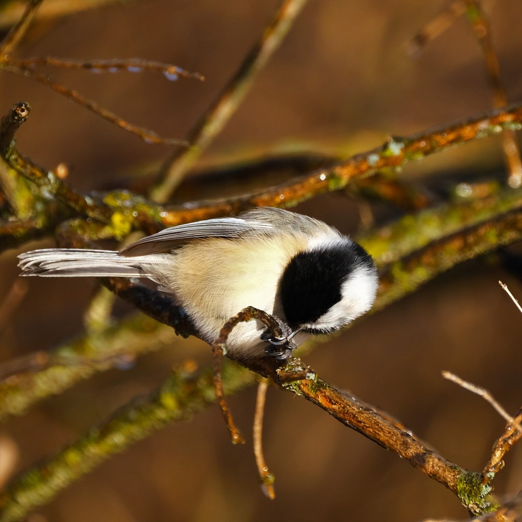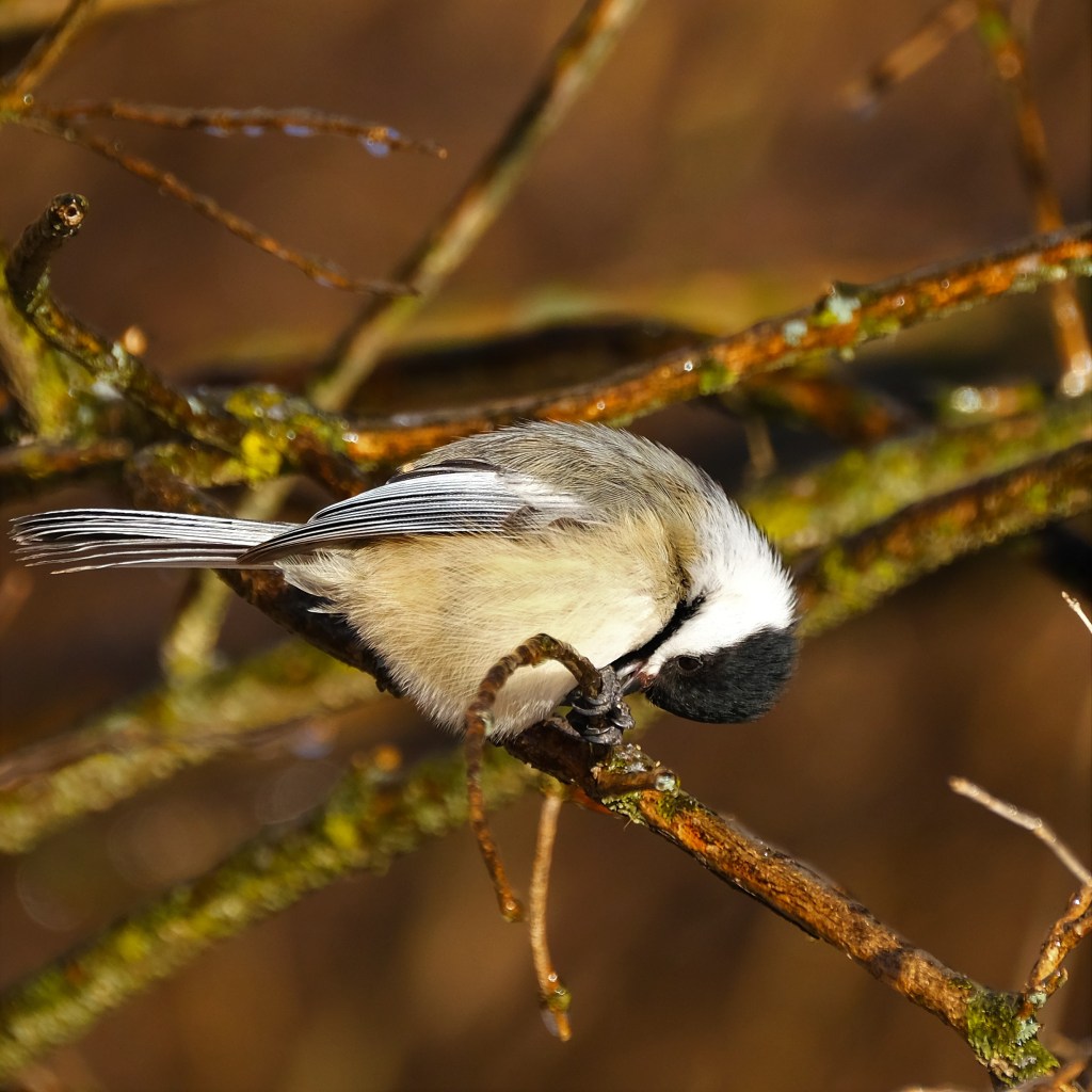 Cardinals weren’t the only ones singing, either. Here’s a chickadee by the pond that alternated between working on that seed it has clamped to the branch with its toes and singing that sweet, two-note, chickadee call.