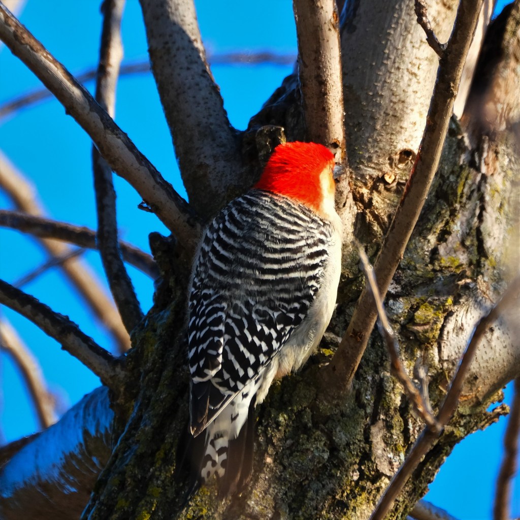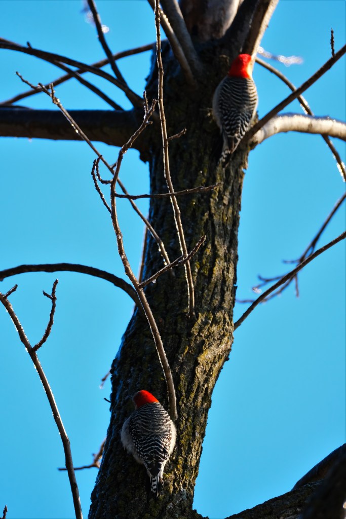 By the river, near the southern edge of the ice sheet, I spotted this pair of red-bellied woodpeckers up to something I haven’t seen before. Here are the two of them.