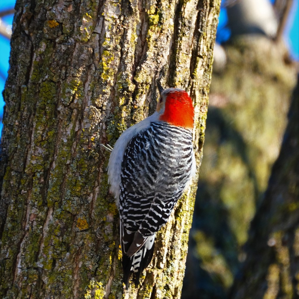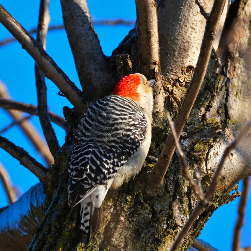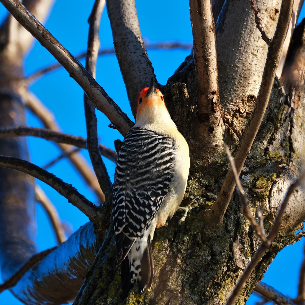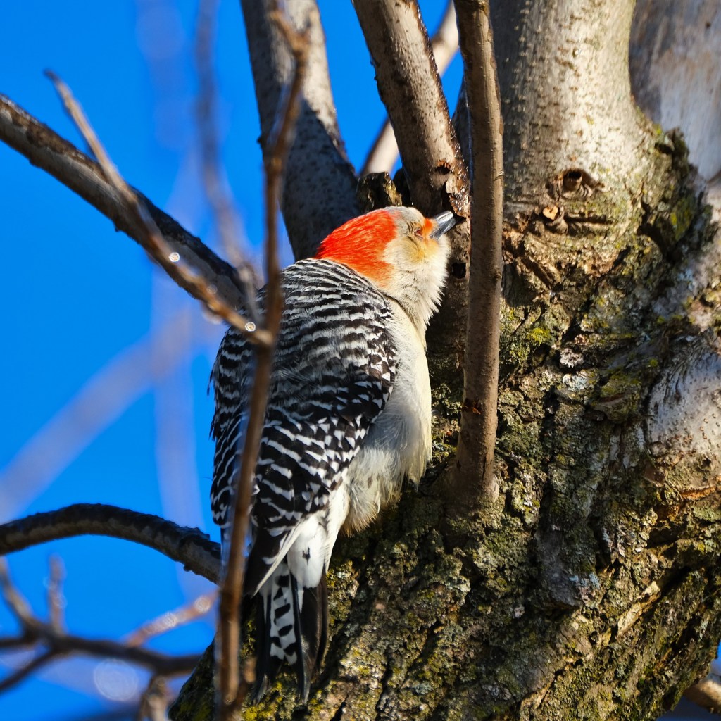 It turns out that red-bellied woodpeckers will sip sap, either from holes they have made themselves or from holes made by other birds, such as yellow-bellied sapsuckers. Ha! I did not know that until I looked it up just now.