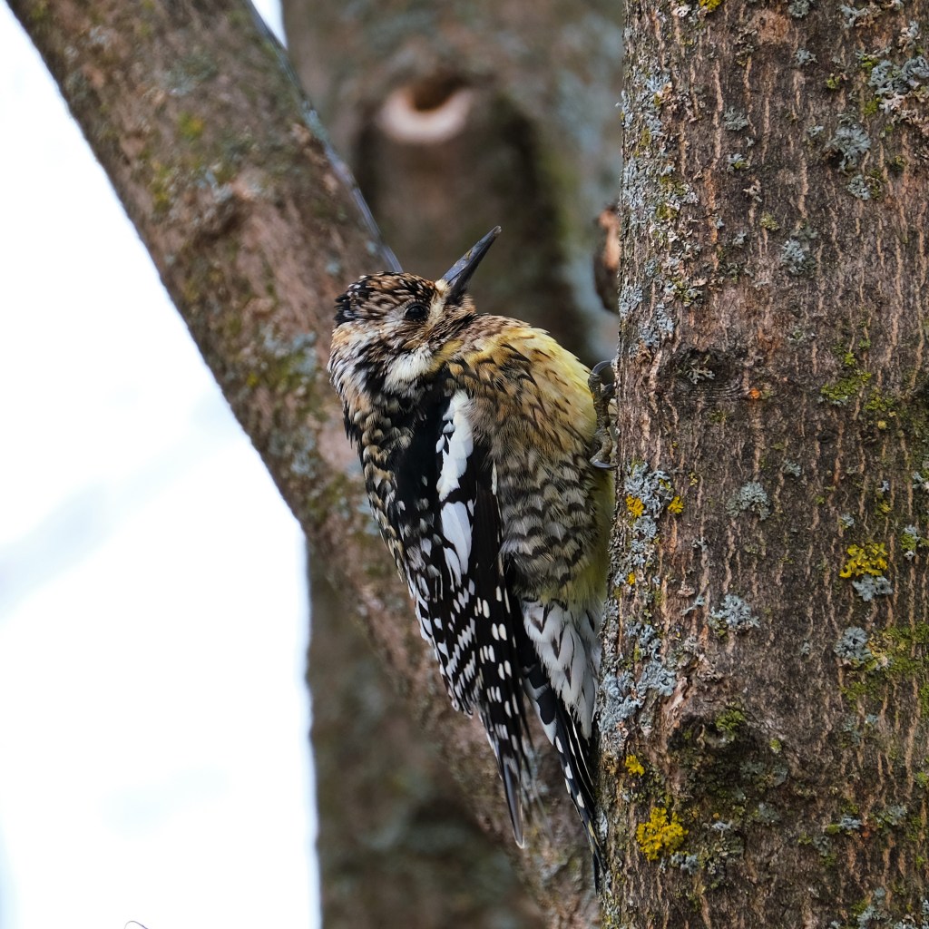 The yellow-bellied sapsuckers must have heard that the red-bellied woodpeckers were getting into their sap, because I spotted my first one today, this striking juvenile in a maple tree just west of the volleyball court. I’ve never seen a juvy before, so I wasn’t sure who it was at first, but its behavior gave it away. Plus, it really does have a pretty yellow belly, doesn’t it?