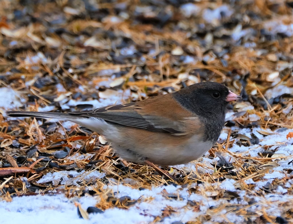Finally, by the pond, I spotted another dark-eyed junco variation, an “Oregon” form this time, to go with the “gray-headed” one we saw on Tuesday.