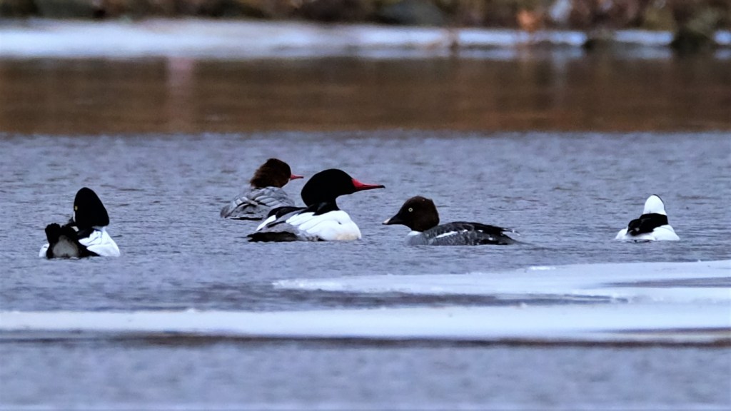 Between the islands, there are still dozens of geese and mallards, plus this odd little grouping of a common merganser hen and drake, a common goldeneye hen and drake, and a bufflehead drake.