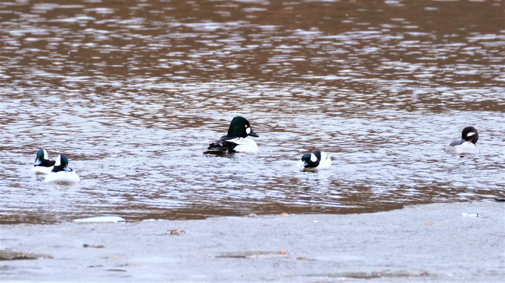 I’m pretty sure I spotted four bufflehead drakes and one hen, and here’s one of the drakes preparing to chase away two others as the hen preens herself and a goldeneye drake wonders how he got himself mixed up in this little love quadrangle, and yes, I could really have used a polarizing filter for this picture.