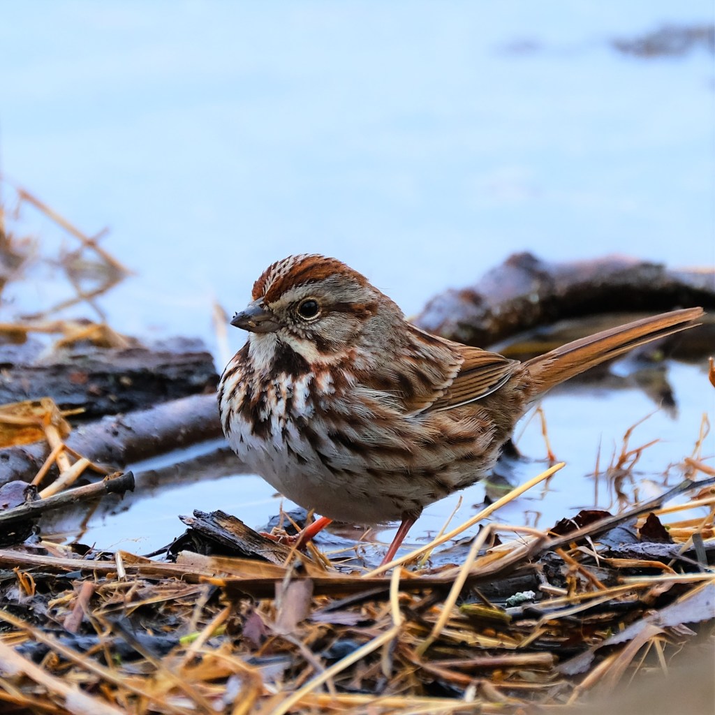 Finally, on my way back south, I spotted this handsome song sparrow busily chirping and foraging on the riverbank.