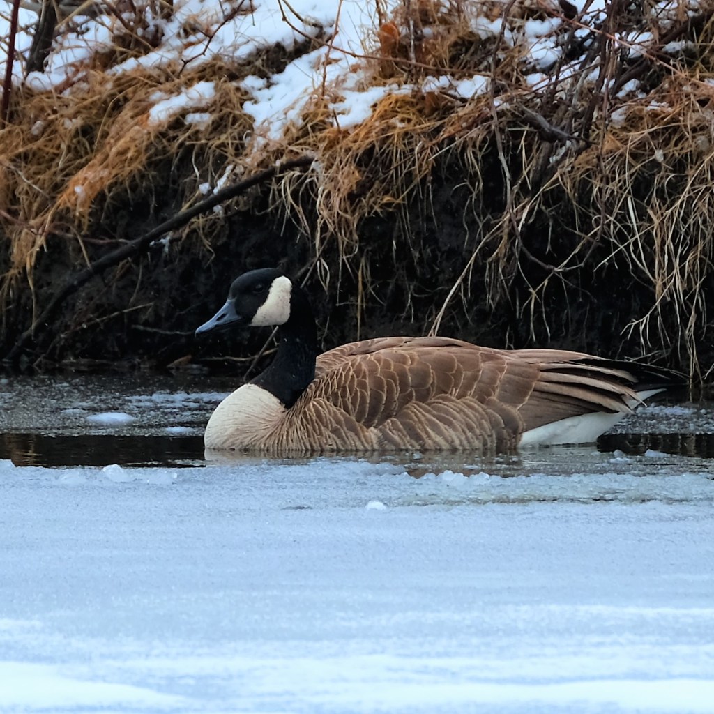 Another new sight for the season was the pair of geese at the pond taking another step towards nesting on the island. Here’s one checking out the little strip of open water off the southern tip.