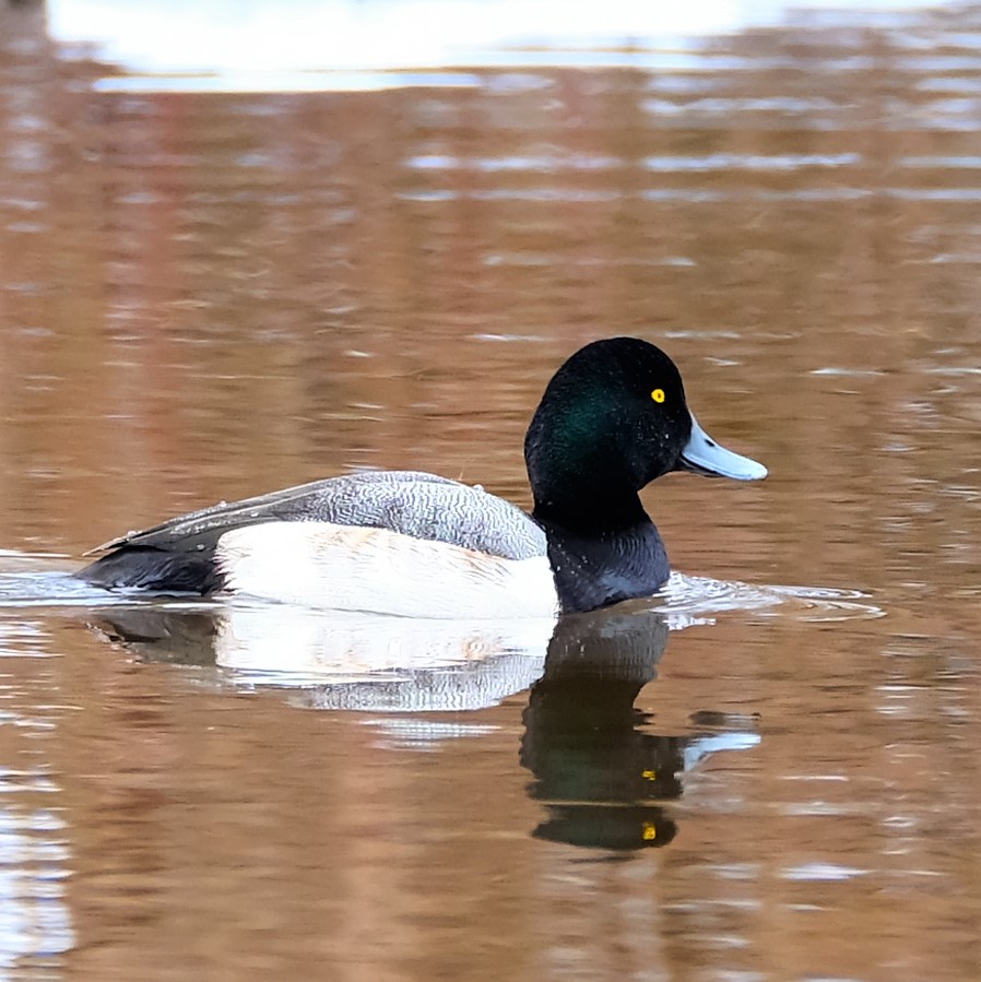 Around the northern island, I counted about 4 dozen geese, nearly the same number of mallards, 8 common merganser, 14 goldeneyes, and 5 buffleheads, but I didn’t see the scaup hen today. This time, the buffleheads comprised 3 drakes and 2 hens.