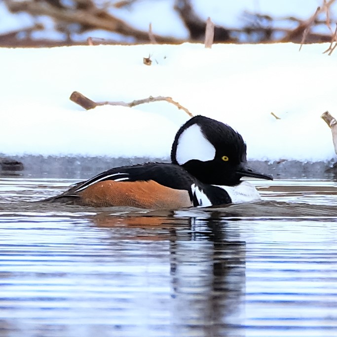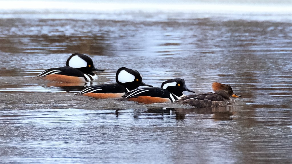 On my way back south, after I thought I had seen everything there was to see, look who else I found on the water above the falls. A little horde of hooded mergansers! There were 4 drakes and 2 hens, but I have no idea if the hen who stuck with us on the lower river through the deep freeze was among them. We sure can hope that she finally found her clan, right?