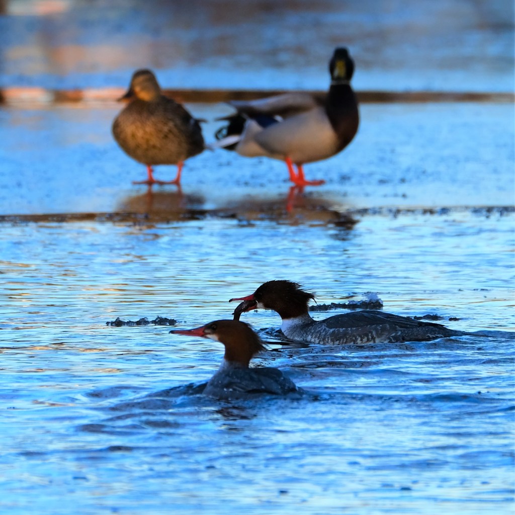 And here’s a common merganser hen who caught herself a nice little fish, her girlfriend who just wants to help, and a pair of mallards looking on in bemusement.