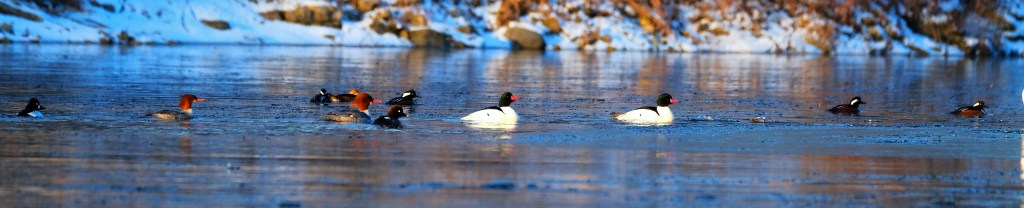 Between the islands, there were even more birds, if you can believe it, and this panorama is chock full ‘o goldeneyes, common mergansers, and hooded mergansers.