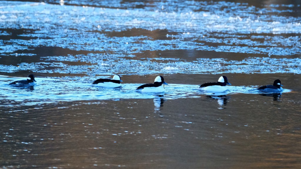 And here’s a little train of bufflehead drakes following one hen while a second hen looks on.