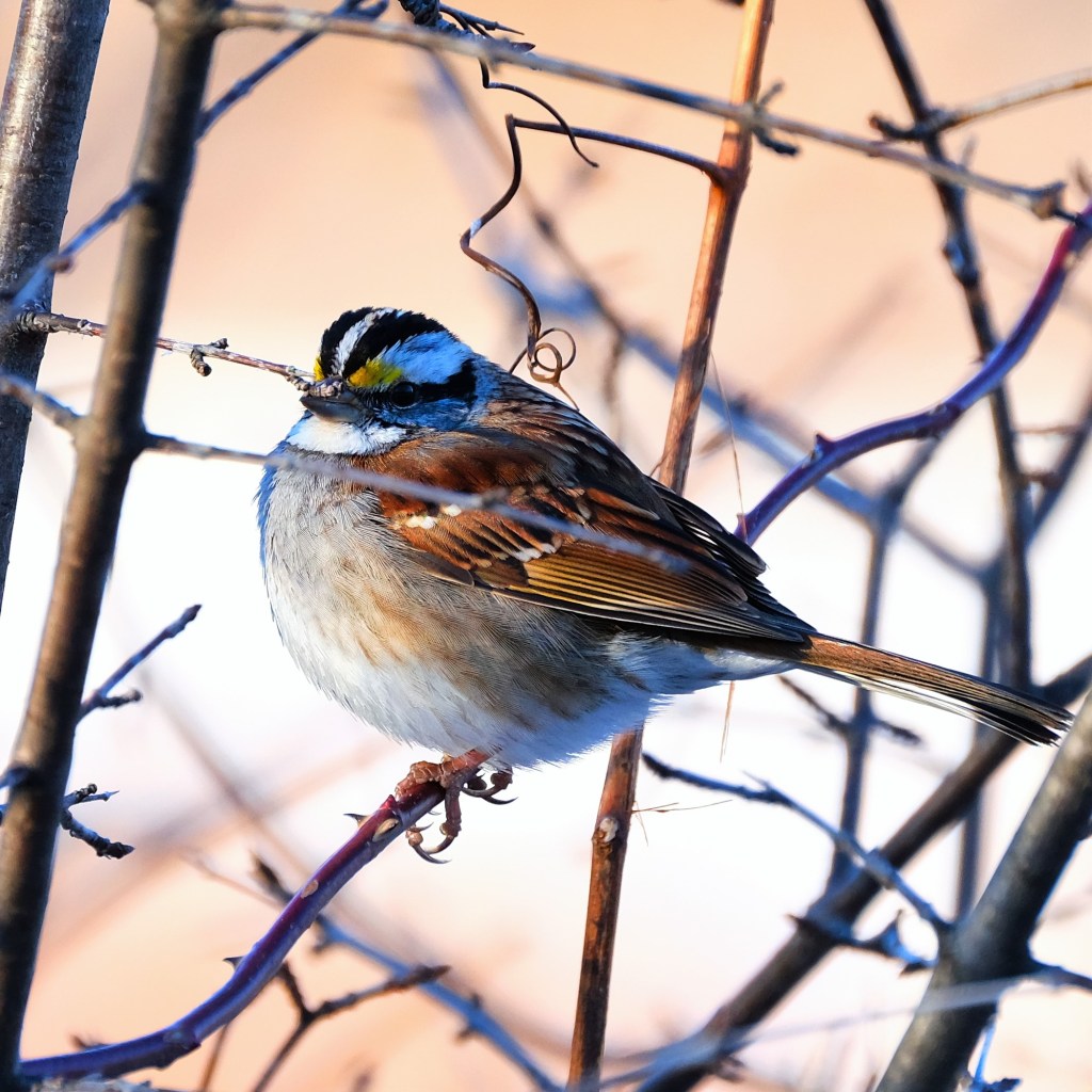 Meanwhile, over by the pond, a trio of white throated sparrows stopped by, and this one was a tad too slow to completely evade my camera.
