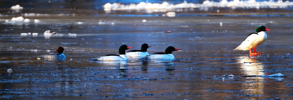 Between the islands, I counted 10 common mergansers, more than I think I’ve ever seen, and here are the 5 closest together that I could capture.