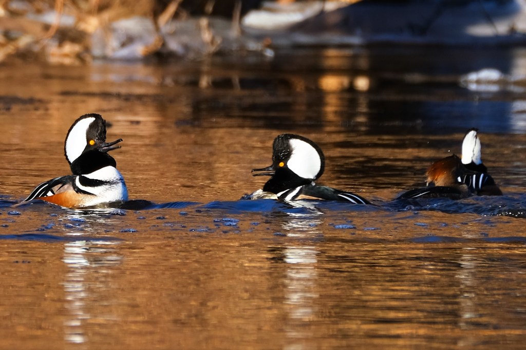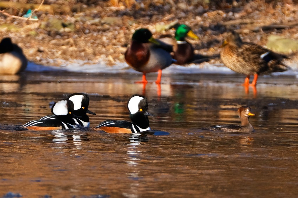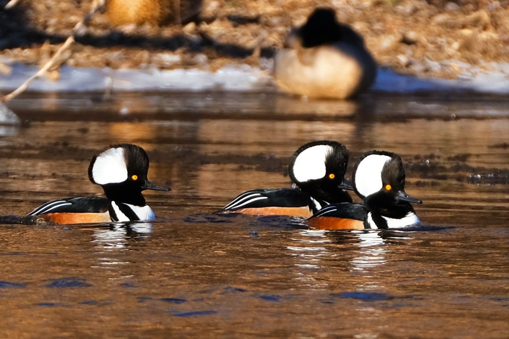 The most interesting spectacle of the morning, however, were these three hooded merganser drakes vying for the attention of one hen. It appears that an important judging criterion is the size and fullness of the hood, which I guess isn’t very surprising given the fact that they have “hoods” at all.