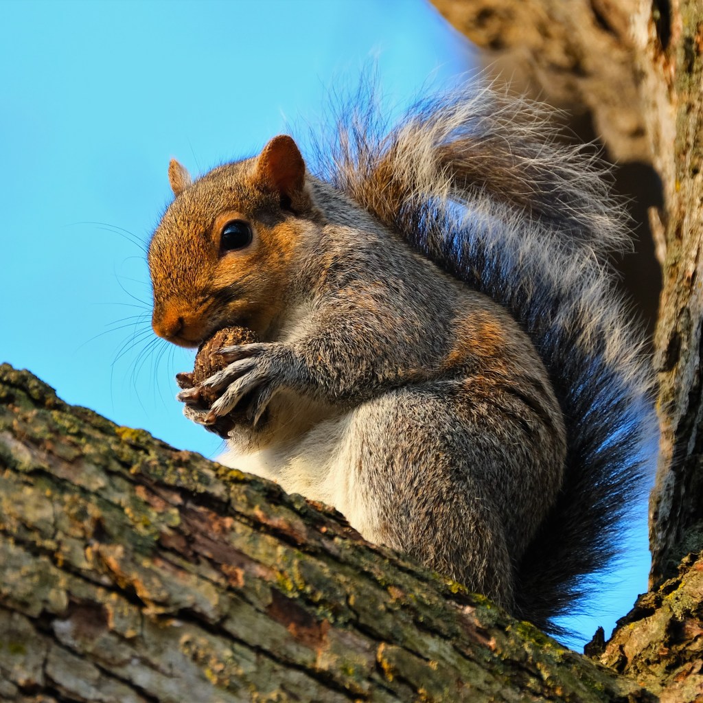 Anyway, another first for the season was the little chipmunk that scampered across the trail in front of me. It had no time for me or my camera, but this grey squirrel already had its morsal and was luxuriously munching on it beside the pond in a brief slice of sun. “Why don’t ya take a picture? It’ll last longer.” “Thanks! Will do!”