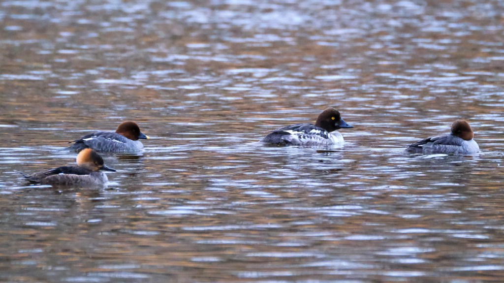 At the north end, the crowd of buffleheads have moved on and left only one pair behind. Similarly, the flock of common mergansers have flown north and left just one hen behind. There were still 3 pairs of hooded mergansers and about the same goldeneyes, but the interesting sight for me was this little quartet of misfits. I see a solo hooded merganser hen, two goldeneye hens, and one young goldeneye drake who doesn’t yet have his mating plumage. They look about as thrilled as the wedding guests at table 19.