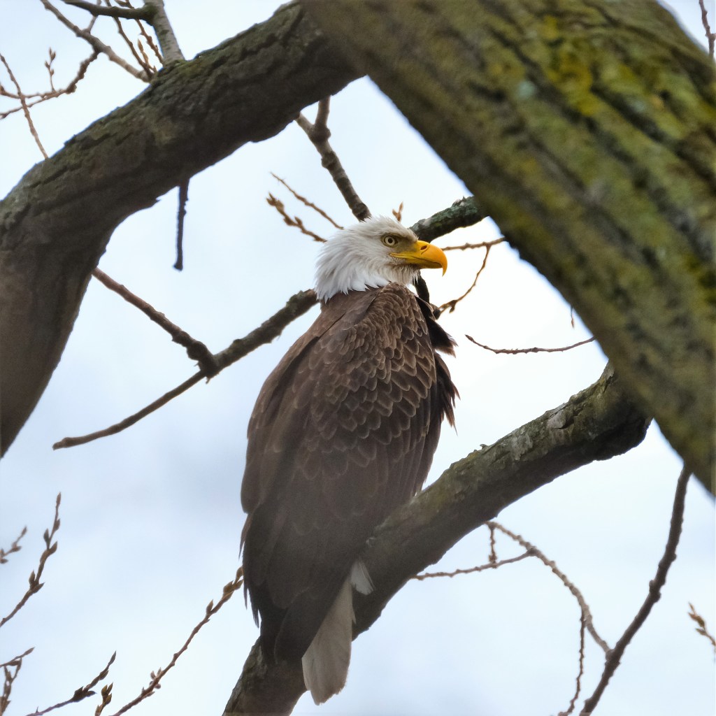 A bald eagle came by again, stared at the floating duck buffet for a while, and then flew back upriver. It’s beak appears to have different markings from the one we saw earlier this week.