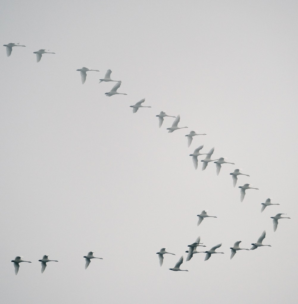 As I hiked from the river to the pond, I glanced up in time to catch this amazing spectacle of nearly three dozen swans flying north in a big v-formation. That’s certainly a first for me.