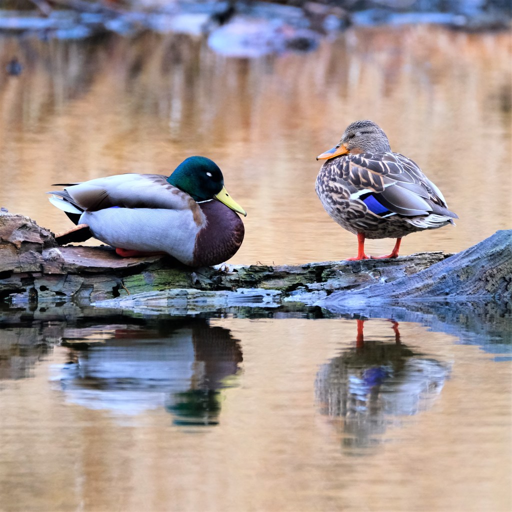 Finally, at the pond, the pair of Canada geese were there but not yet nesting, a pair of mallards was dabbling, and this pair of mallards was snoozing on a log. I don’t believe I’ve ever caught both with their eyes closed at the same time before.