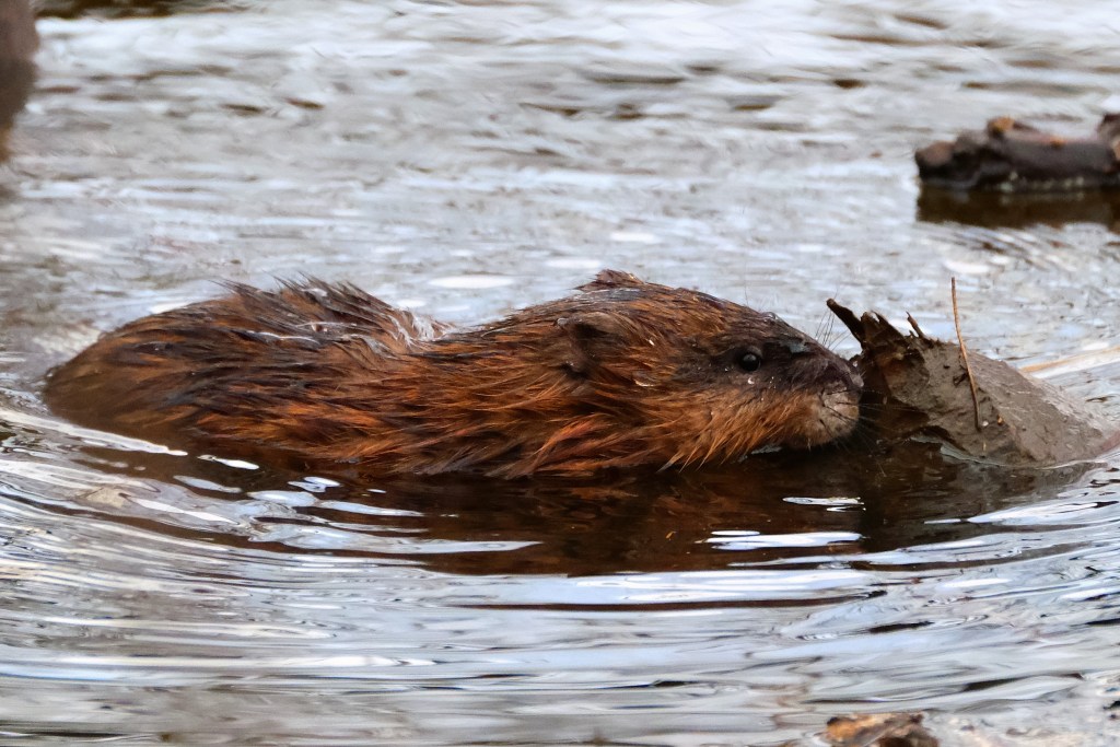 I saw neither the beaver nor the muskrat, but here’s another muskrat picture from yesterday, in which it appears to be sniffing an old beaver-gnawed log.
